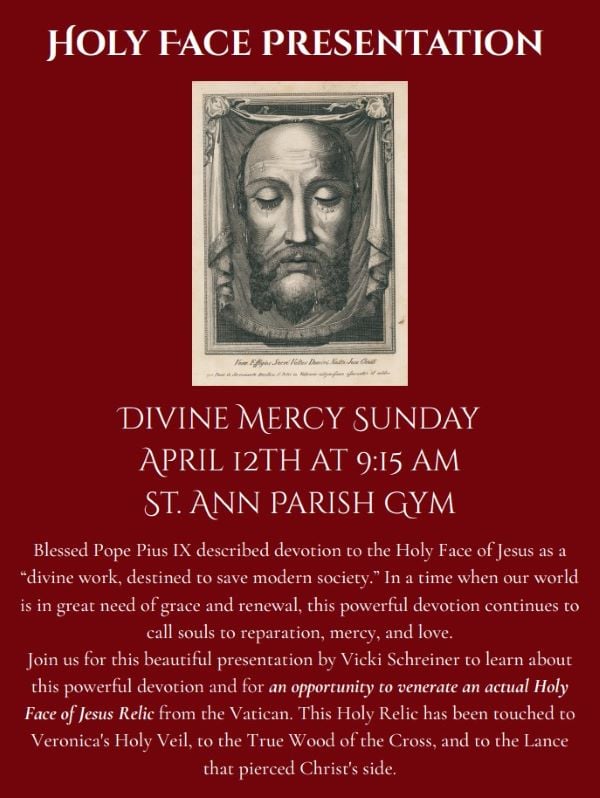 Special Talk on the Holy Face of Jesus – Next Sunday April 12 at 9:15 a.m. Saint Ann parish will host a special talk on the Holy Face devotion by Vicki Schreiner to allow the faithful to learn about this powerful devotion. There will also be an opportunity to venerate an actual Holy Face of Jesus relic, which has been touched to Veronica’s Holy Veil, the True Cross, and to the Lance that pierced Christ’s side. The talk will be in the gym. See flyer at the end of this update.